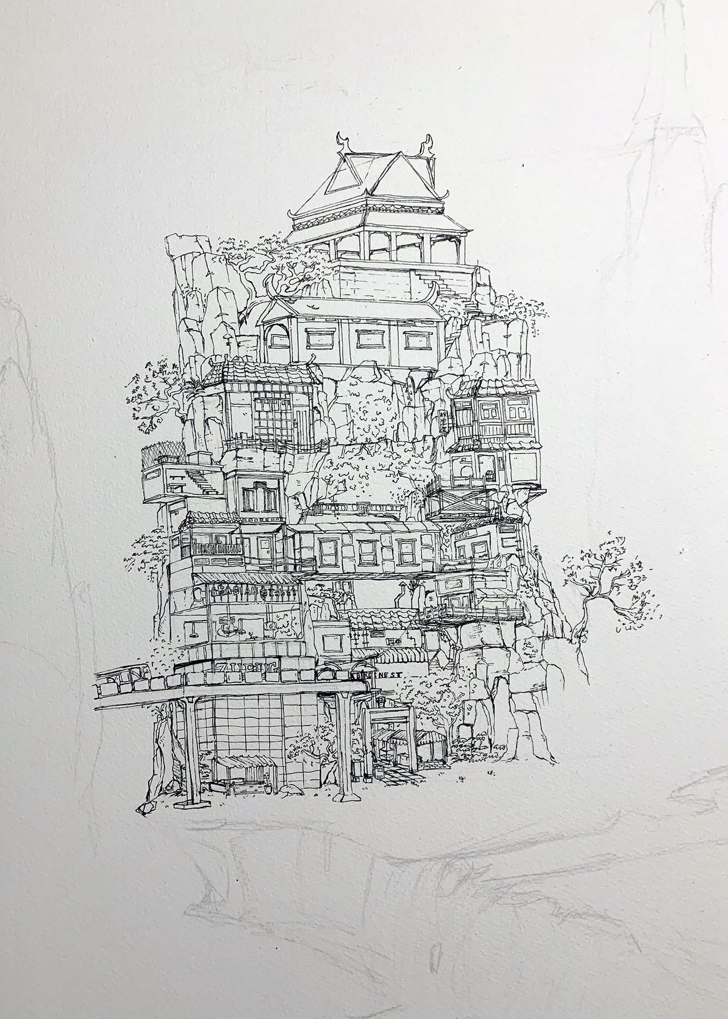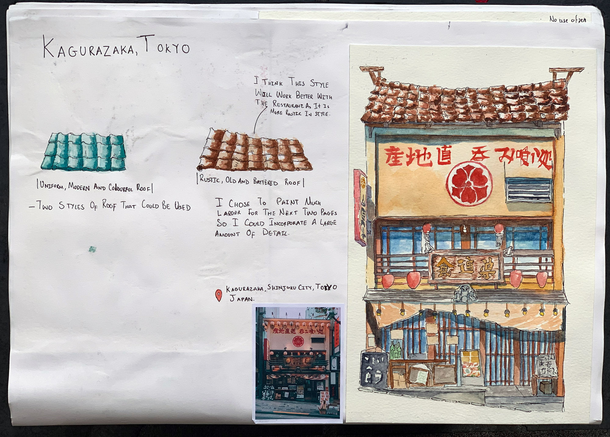 Initial sketches planning my final outcome based on combining my work on watercolour, fine liner and sumi ink in a hanging scroll format.