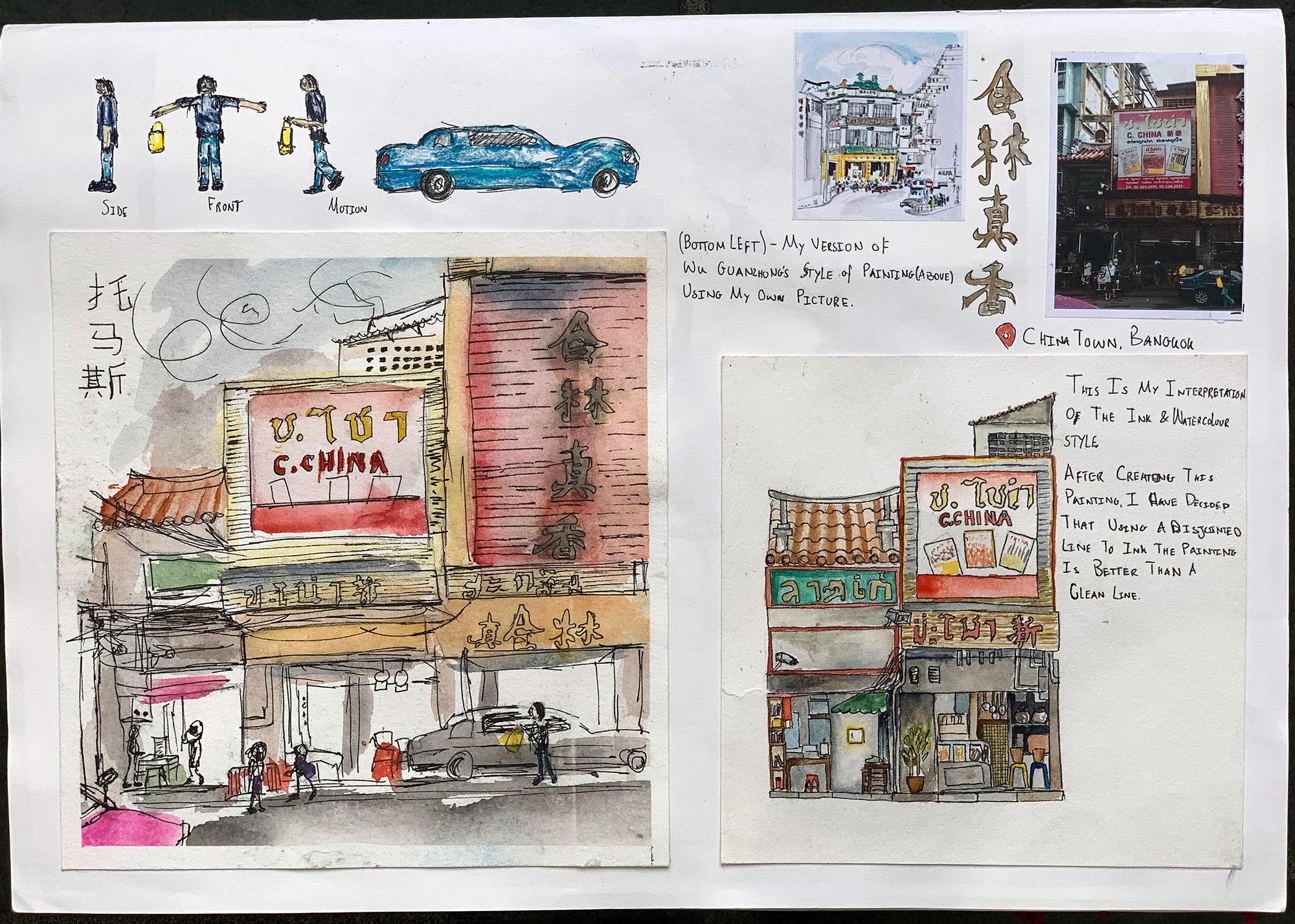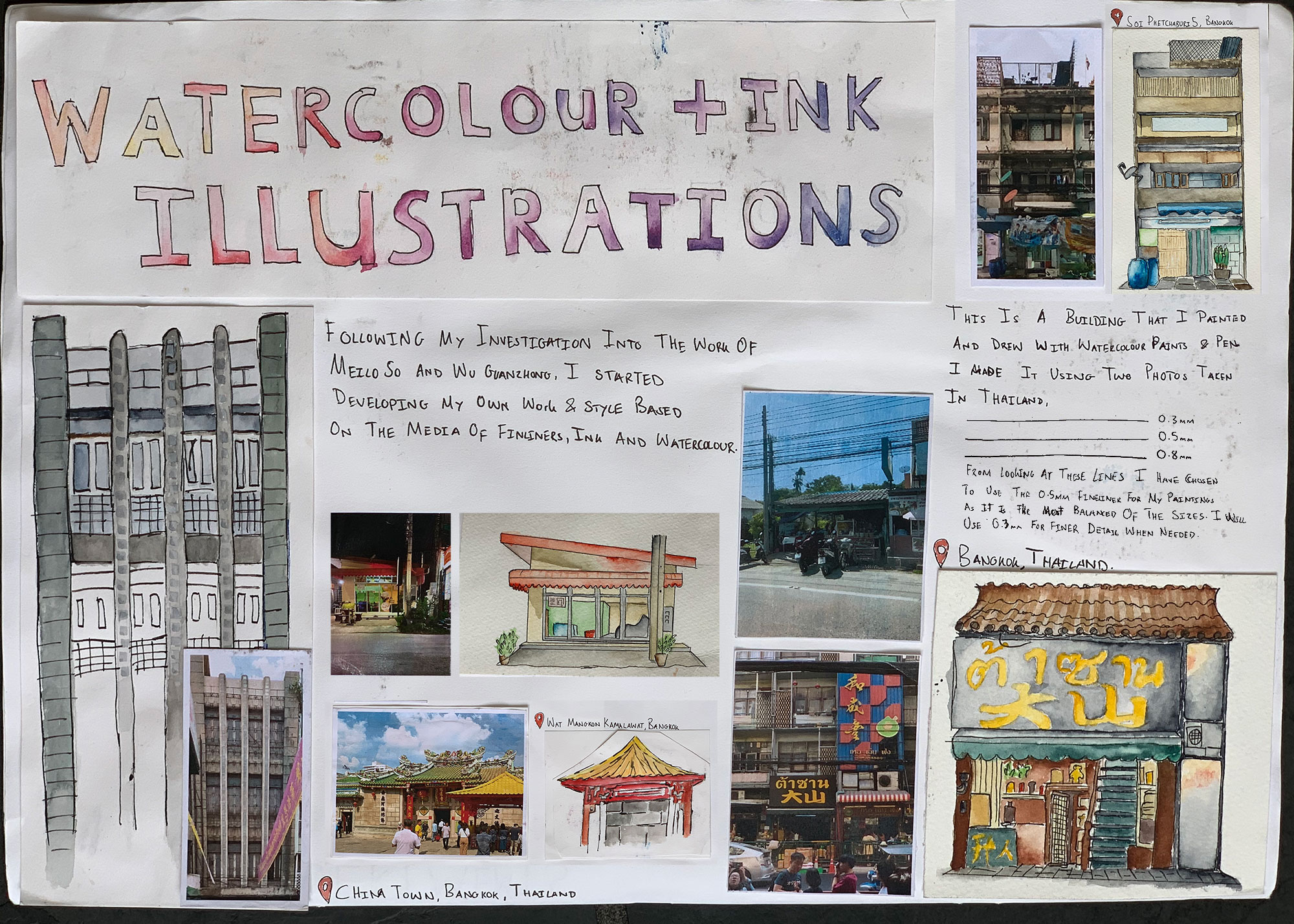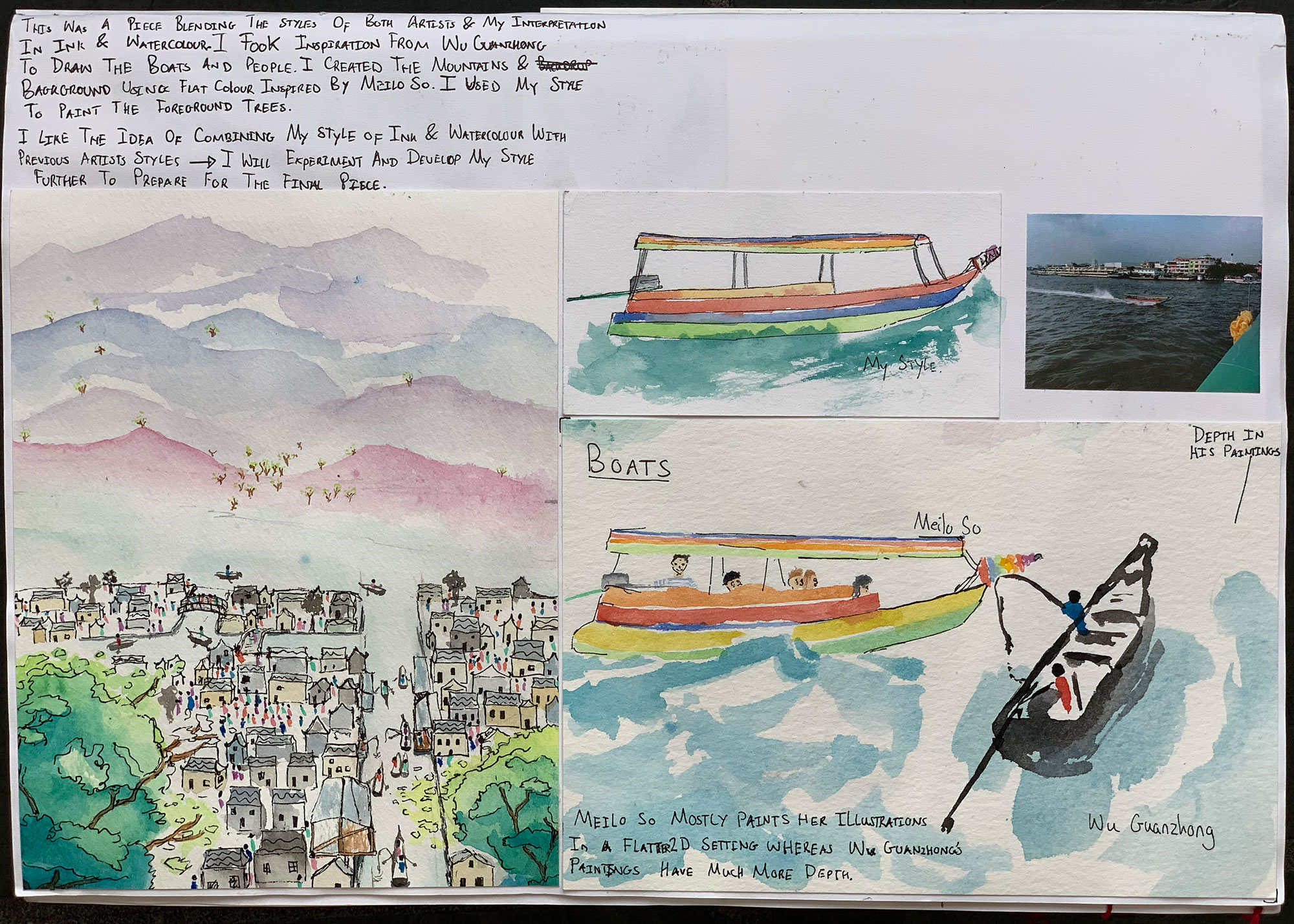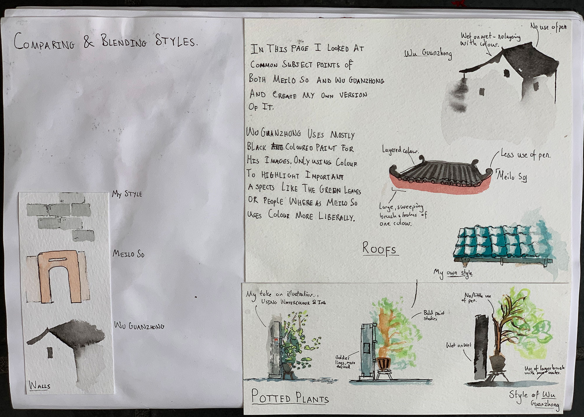 This is work from my A-level sketchbook based around exploring watercolour and ink in traditional Chinese paintings and how its use has change of time. I explore the techniques of Wu Guanzhong, a traditional Chinese painter, and Meilo So, a modern illustrator, and reference them to develop my own work and technique using the media.