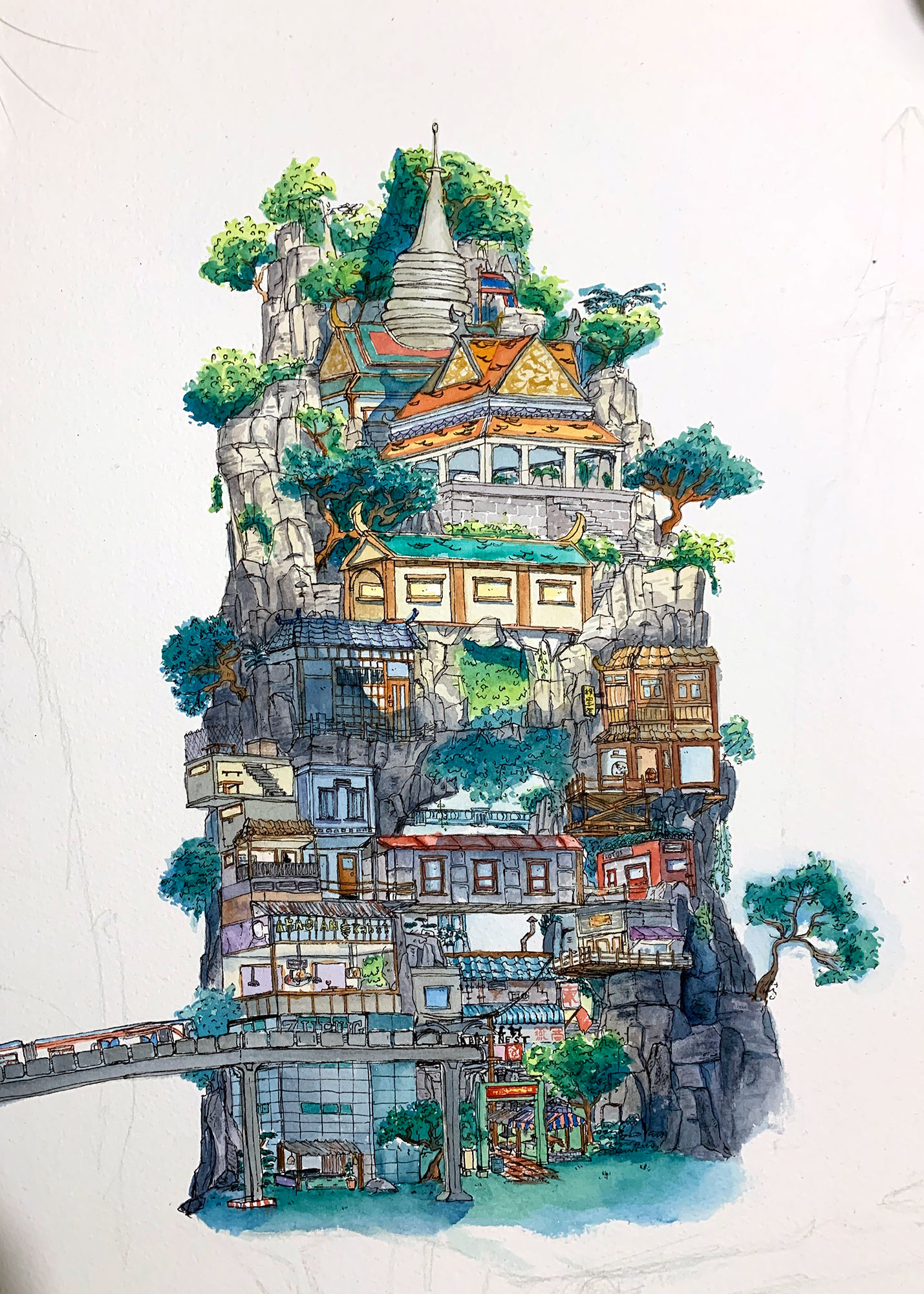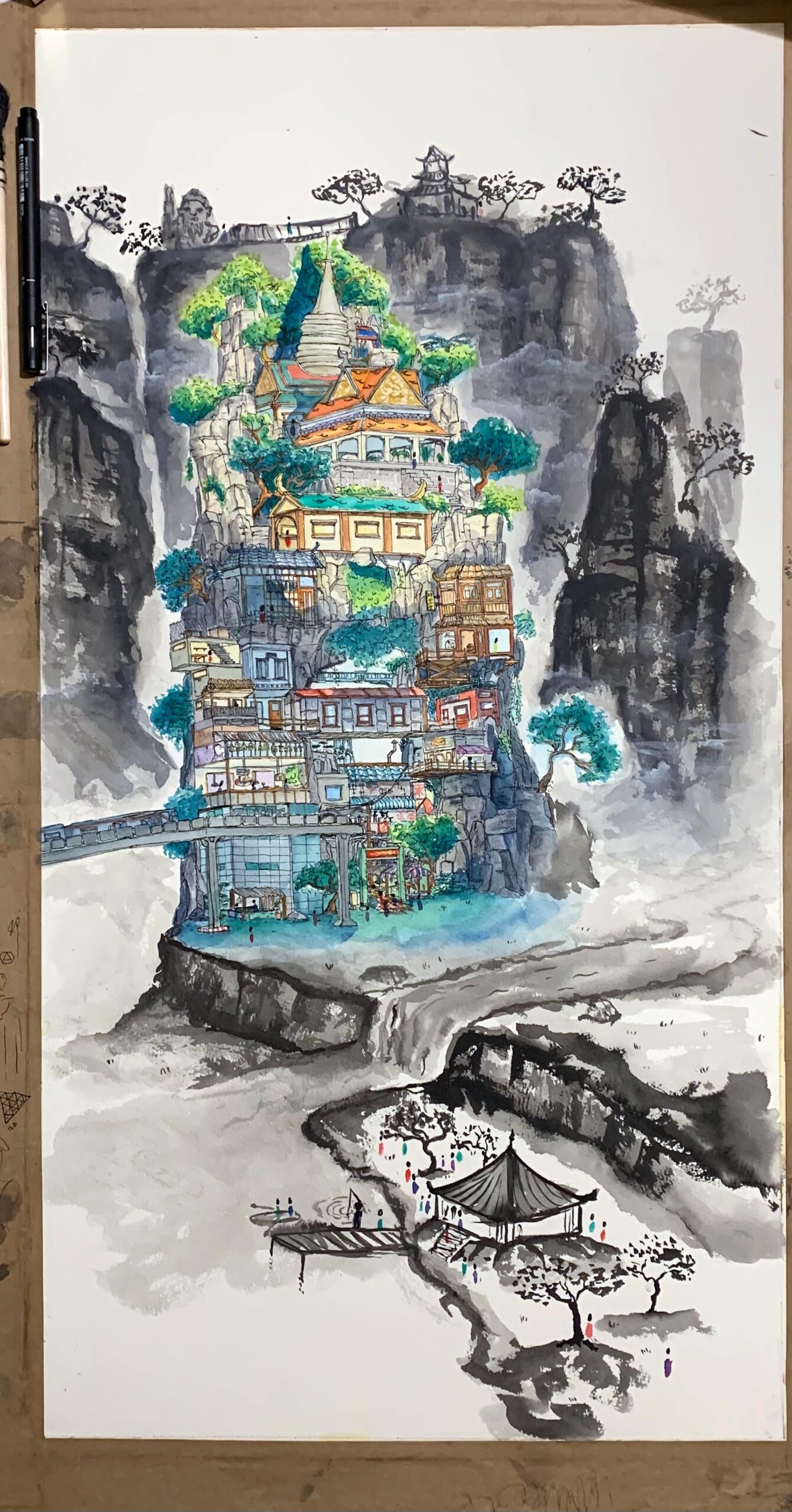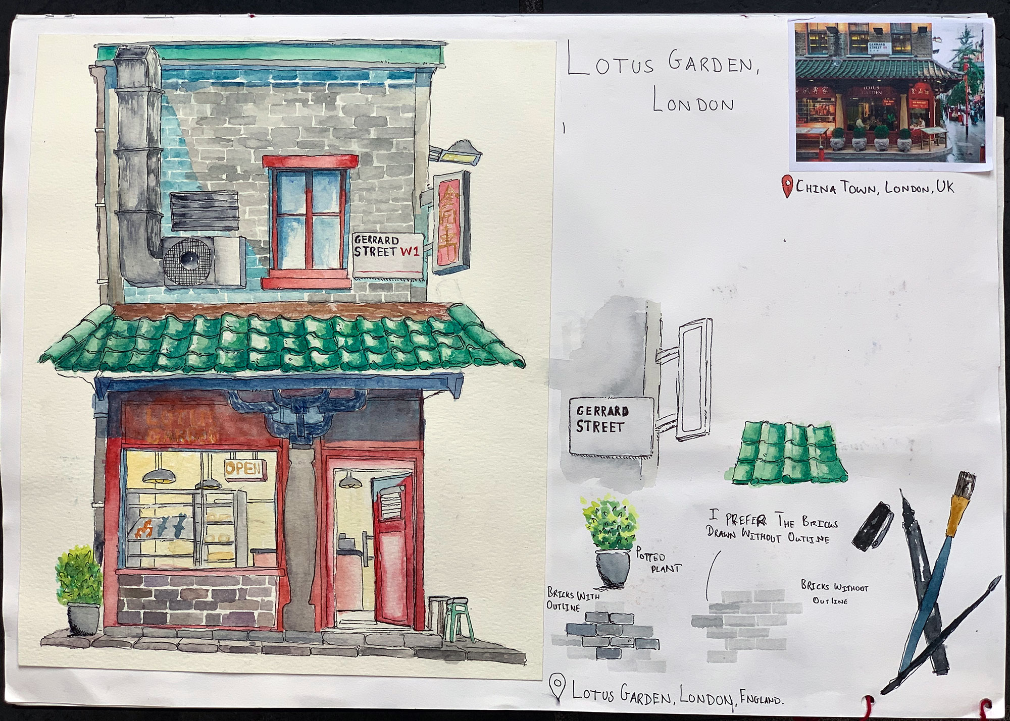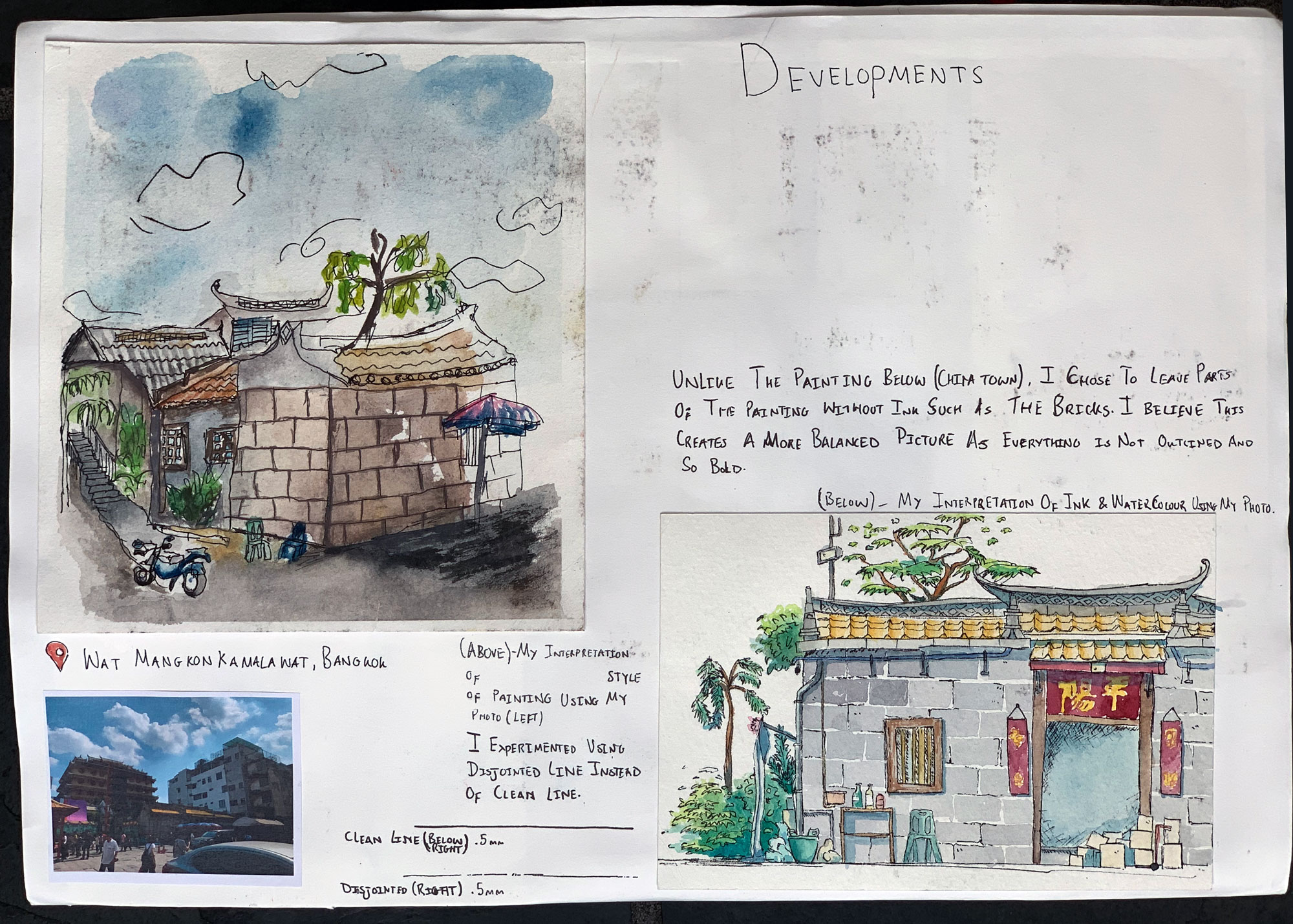 This is work from my A-level sketchbook based around exploring watercolour and ink in traditional Chinese paintings and how its use has change of time. I explore the techniques of Wu Guanzhong, a traditional Chinese painter, and Meilo So, a modern illustrator, and reference them to develop my own work and technique using the media.