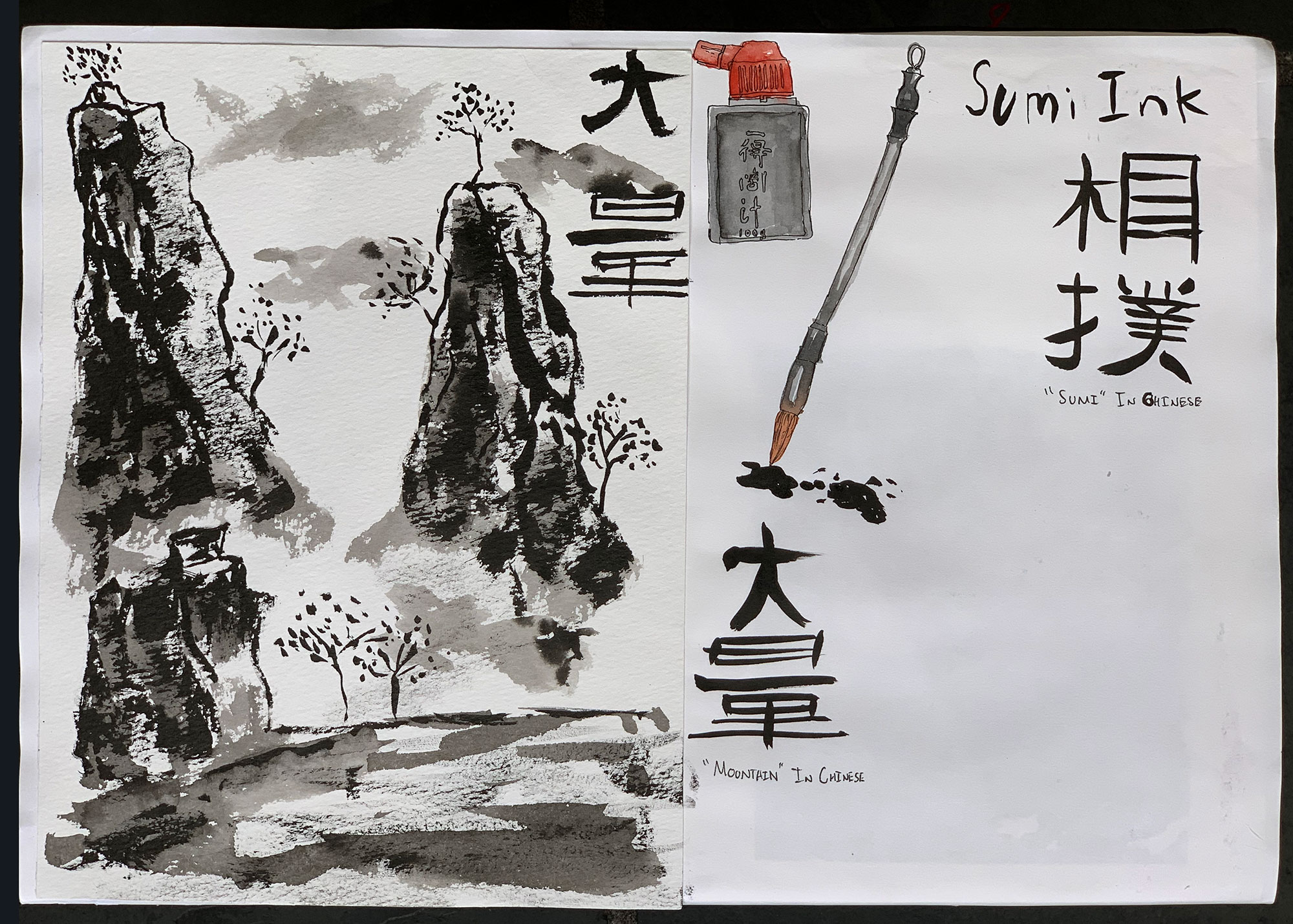 Initial studies investigating sumi ink, looking at landscapes and Chinese calligraphy.